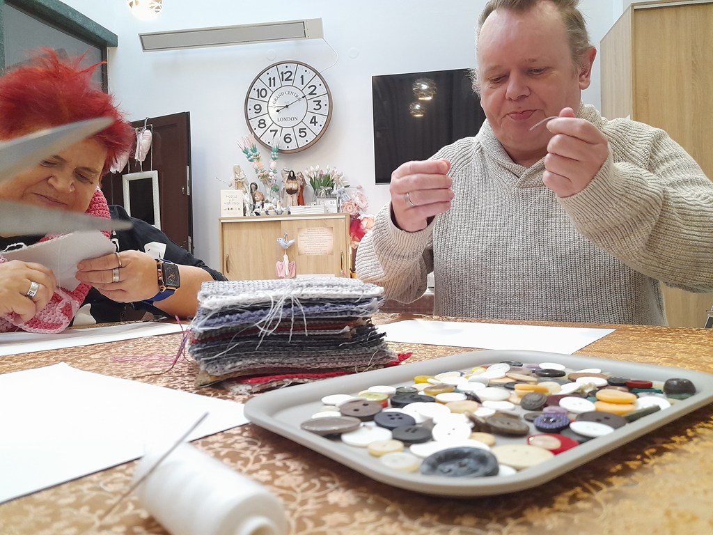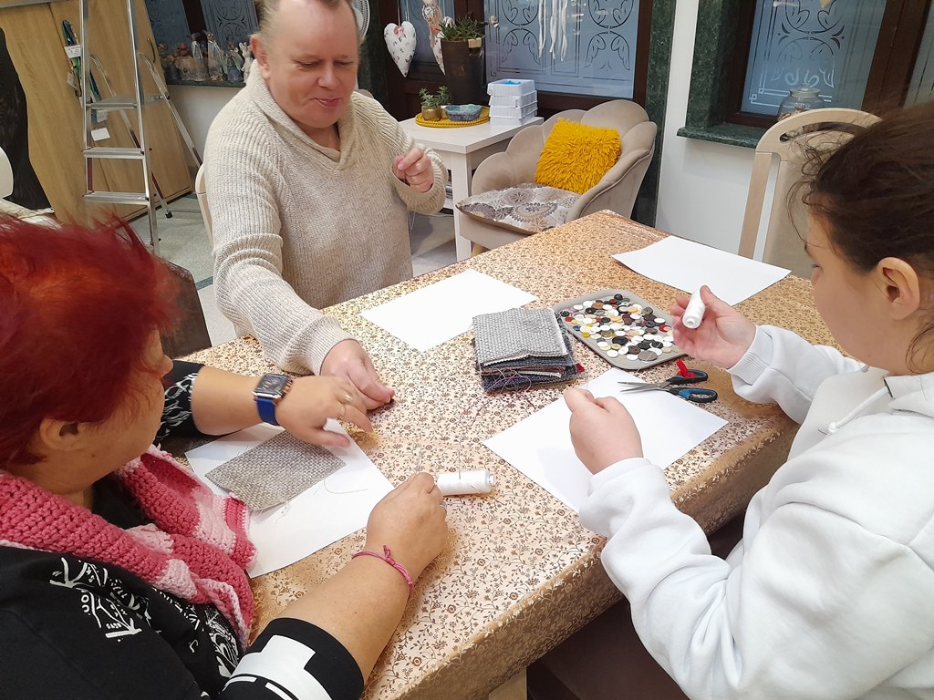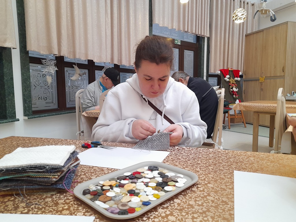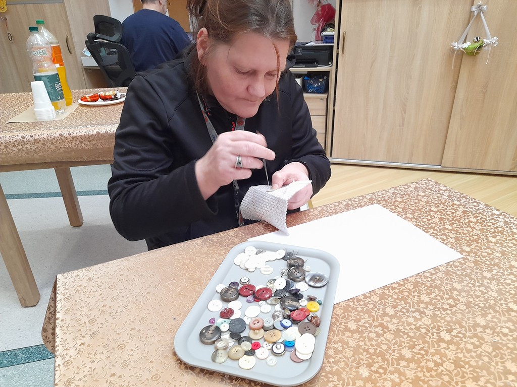 TAKIE NIBY NIC, A JEDNAK.... Zajęcia z przyszywania guzików rozwijają uczestników na wielu płaszczyznach – zarówno praktycznej, jak i terapeutycznej. W szczególności: