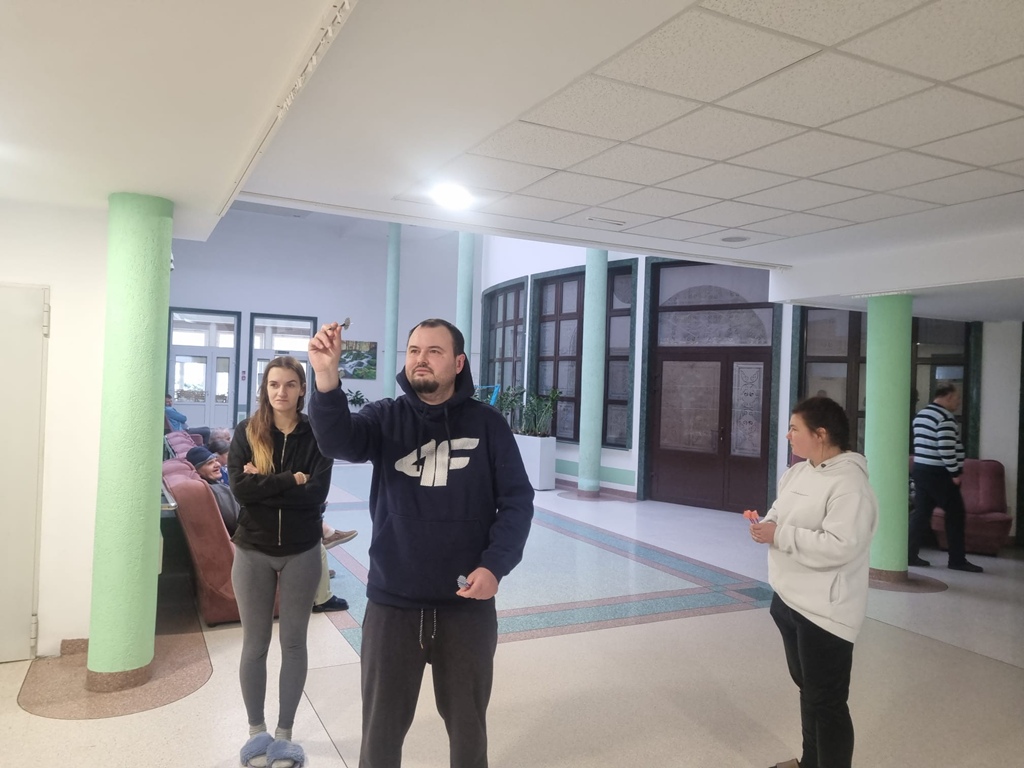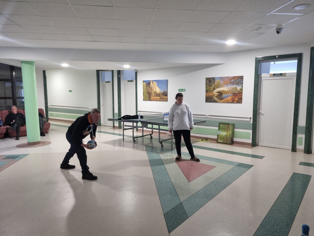 Zimowe dni w Domu Pomocy Społecznej w Lubuczewie wcale nie muszą być szare i monotonne! Nasz hol zamienia się wtedy w prawdziwą sportową arenę pełną śmiechu, emocji i zdrowej rywalizacji. Gra w dart uczy koncentracji i precyzji – każdy rzut to chwila skupienia, a trafienie w środek tarczy wywołuje prawdziwą falę radości. Przy kręglach nie brakuje dopingu i gromkich braw – przewracające się kręgle wywołują szerokie uśmiechy i mobilizują do kolejnych prób. Z kolei badminton dodaje energii i lekkości – lotka szybująca nad siatką zachęca do ruchu, poprawia koordynację i sprawność. To nie tylko świetna zabawa, ale też doskonały sposób na utrzymanie dobrej kondycji, wzmocnienie mięśni i integrację mieszkańców. Sport w naszym holu rozgrzewa nie tylko ciało, ale i serca!