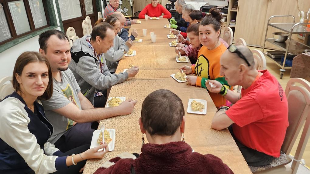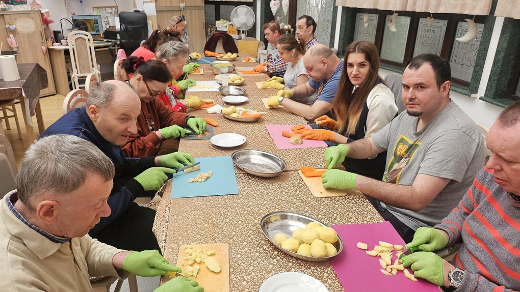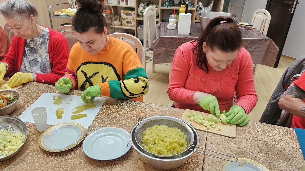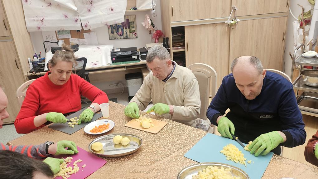 Podczas dzisiejszych zajęć kulinarnych wspólnie przygotowaliśmy pyszną, tradycyjną sałatkę jarzynową. Było kolorowo, aromatycznie i oczywiście bardzo smacznie! Uczestnicy z dużym zaangażowaniem obierali, kroili i mieszali składniki, dbając o odpowiednie proporcje oraz estetykę podania. Wspólne przygotowywanie potrawy było doskonałą okazją do ćwiczenia współpracy, komunikacji i wzajemnego wsparcia. Po zakończonej pracy przyszedł czas na degustację – sałatka smakowała wyśmienicie, a wspólne kosztowanie dało nam wiele radości i satysfakcji. Nie zapomnieliśmy również o porządkach, dbanie o czystość to ważny element każdych zajęć kulinarnych. To był czas pełen dobrej energii, uśmiechu i wspólnej pracy. Dziękujemy wszystkim za aktywny udział i już czekamy na kolejne kulinarne spotkanie!
