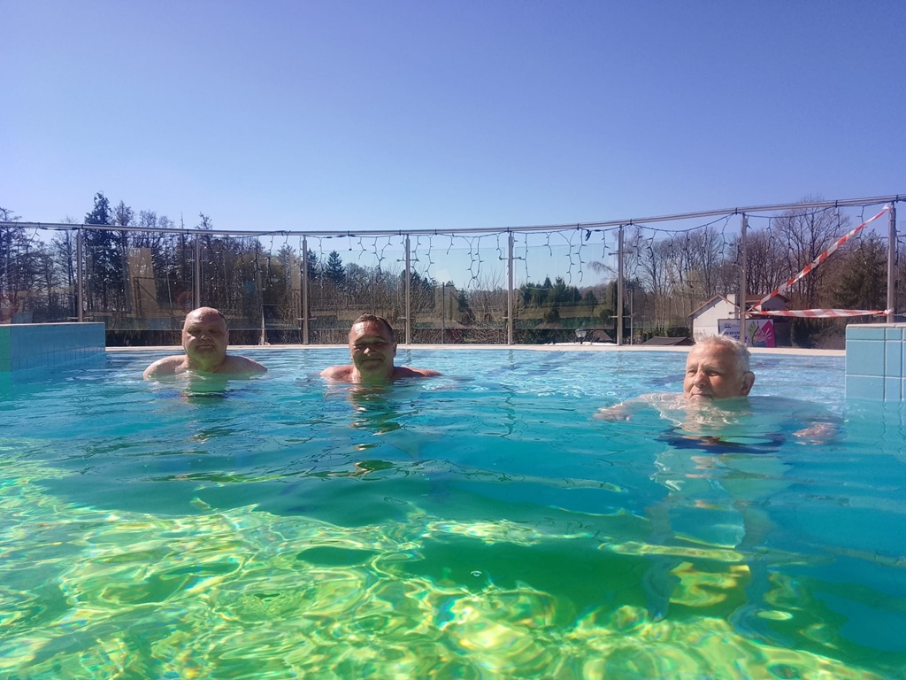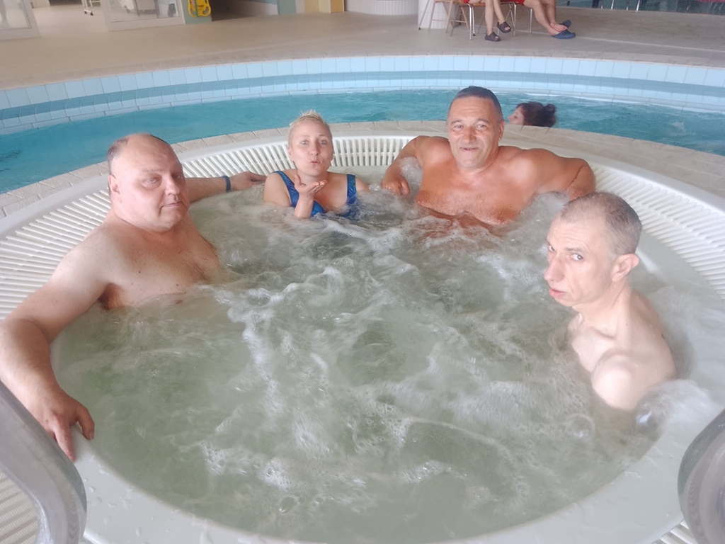 Mieszkańcy wybrali się również na basen, gdzie aktywnie i z radością spędzili czas w wodzie. Zajęcia obejmowały lekkie ćwiczenia ruchowe, które wspierały sprawność fizyczną, poprawiały krążenie oraz wzmacniały mięśnie. Uczestnicy chętnie angażowali się w zabawy w wodzie, ćwicząc równowagę, koordynację oraz oddech. Pobyt na basenie był nie tylko formą rehabilitacji, ale także doskonałą okazją do relaksu i odprężenia. Ciepła woda sprzyjała rozluźnieniu, a wspólnie spędzony czas wprowadził wszystkich w dobry nastrój. Nie zabrakło uśmiechów, rozmów i pozytywnej energii, które na długo pozostaną w pamięci uczestników.